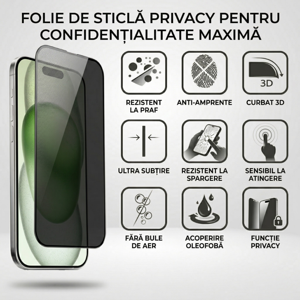 Folie Protectie Ecran iPhone 17 Pro Privacy, Sticla Securizata 3D, Full Glue